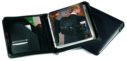 Features : Made of top grain Napa leather. Zippered closure. 1" ring binder. Holds all standard 3-hole-punched material. Inside has a gusseted file pocket, two additional pockets, one with zipper closure. Pockets with PDA and cell phone. Three pen loops. Reversible pad section. Holds 8 1/2" x 11" and A4 pads